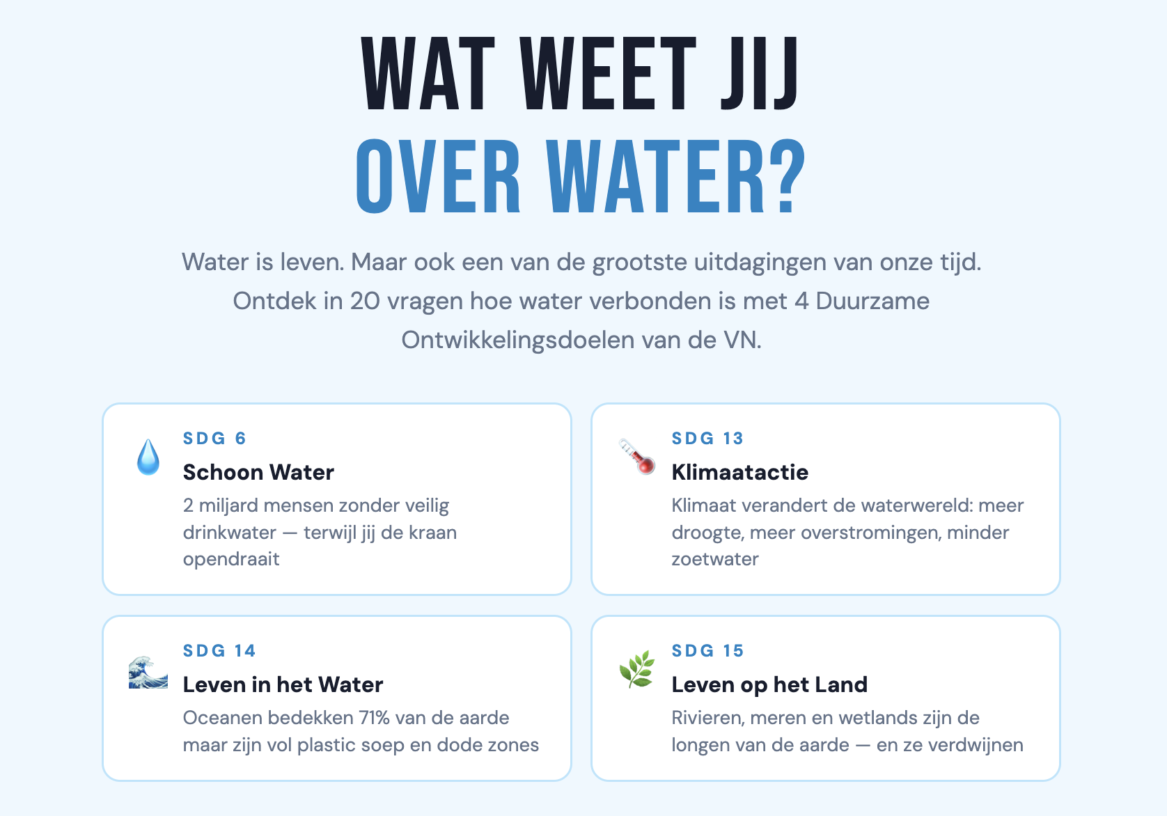 Het zijn doelen die landen, bedrijven, scholen én jongeren helpen om samen een betere, gezondere wereld te maken. Van schone oceanen tot slimme steden en gelijke kansen. (lees hier meer, of bekijk het filmpje over de SDG's)Quiz over water