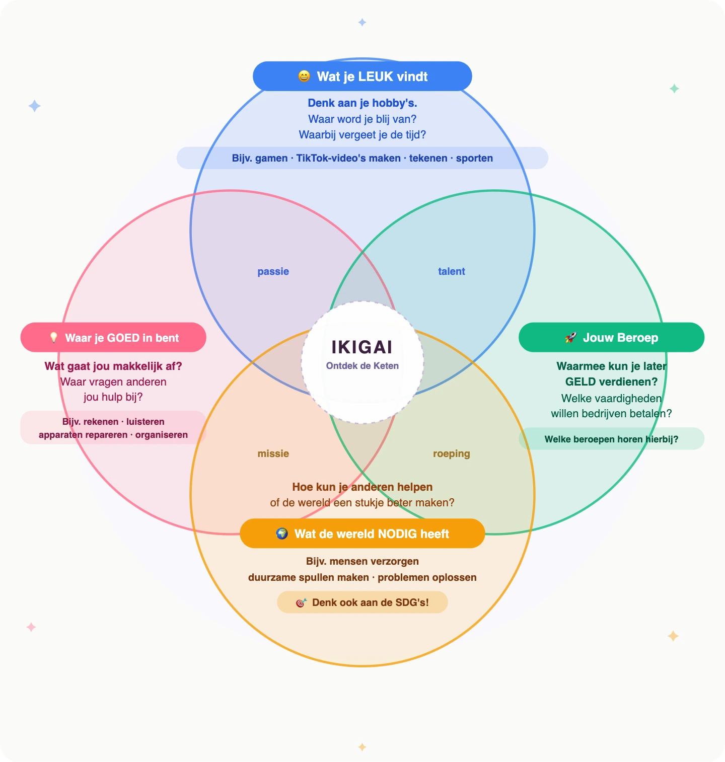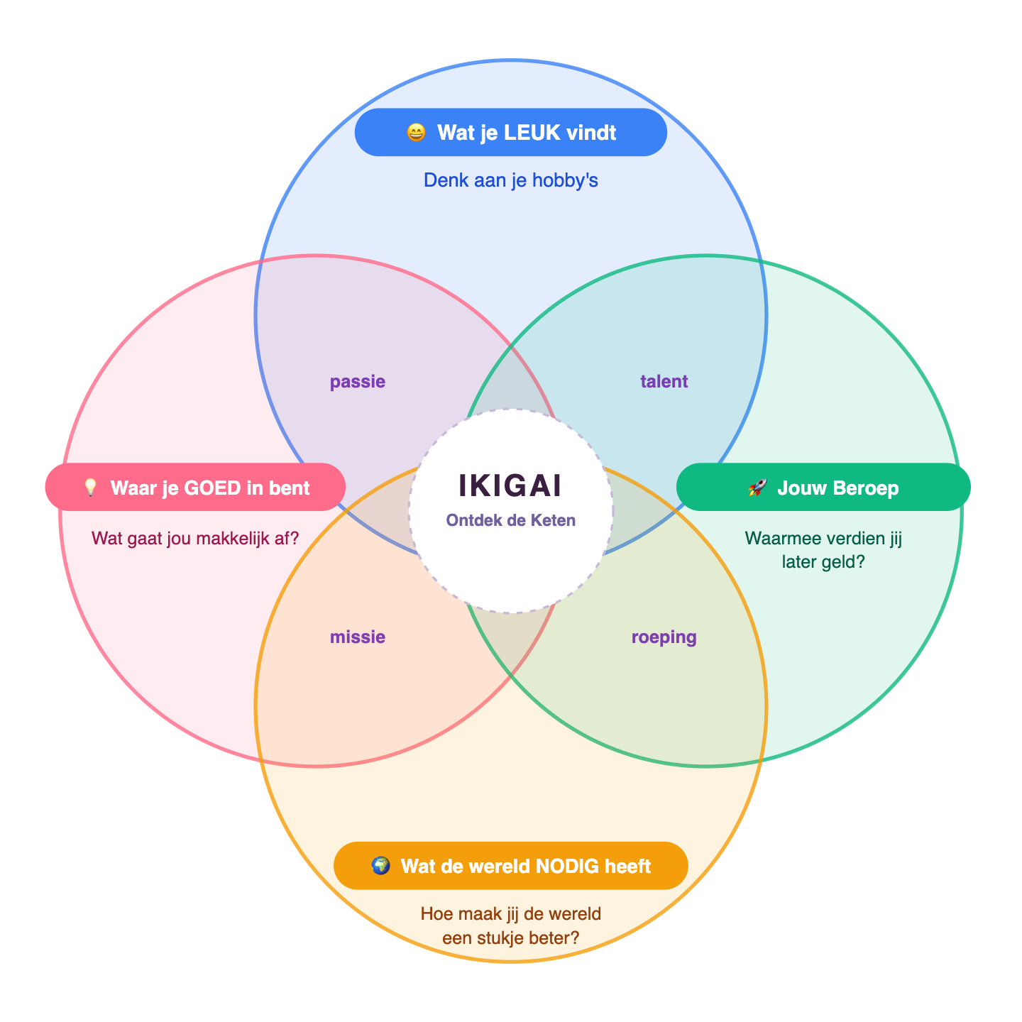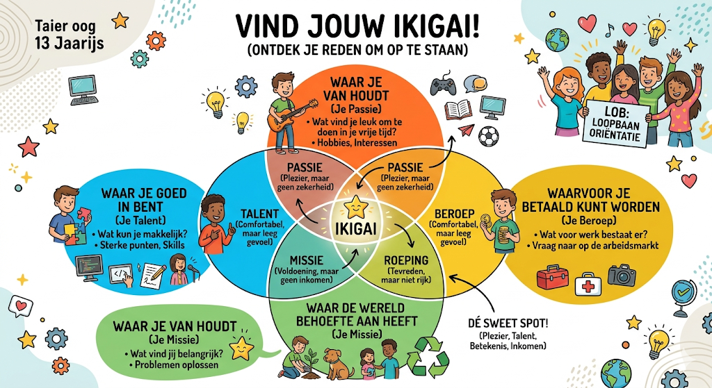 IKIGAI helpt je ontdekken waar plezier, talent, betekenis en toekomstkansen samenkomen.