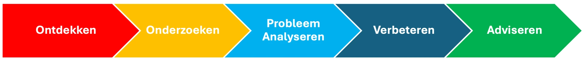Het ontdekken doe je aan de hand van de handige 5 Ontdek de Keten blokken; Ontdekken, Onderzoeken, Analyseren, Verbeteren en Adviseren.