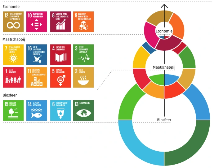 Onderaan zie je de biosfeer: natuur, water, lucht, dieren en planten. Zonder deze laag kan niets bestaan.