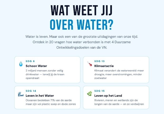 Ontdek in 20 vragen leuke en leerzame dingen over water en hoe water verbonden is met de Duurzame Ontwikkelingsdoelen van de Verenigde Naties. (SDG'S)